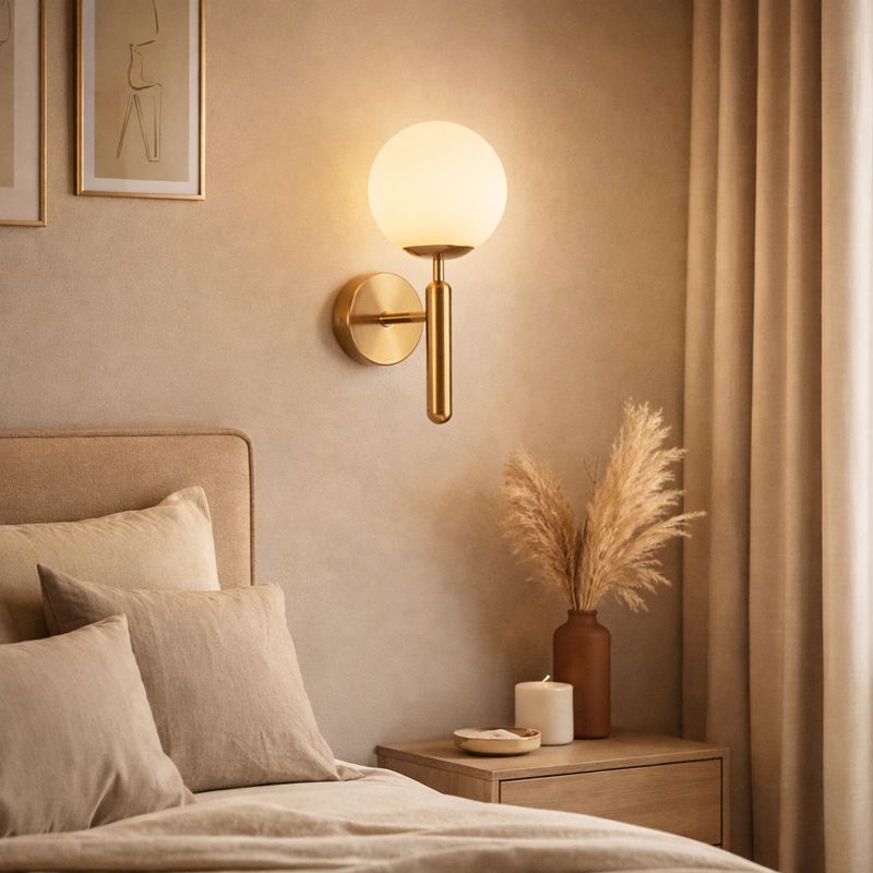 Globul din sticlă difuzează o lumină caldă, plăcută, ideală pentru momentele de relaxare de seară. Finisajul metalic auriu completează armonios nuanțele de bej, crem și lemn, contribuind la o atmosferă calmă și confortabilă.