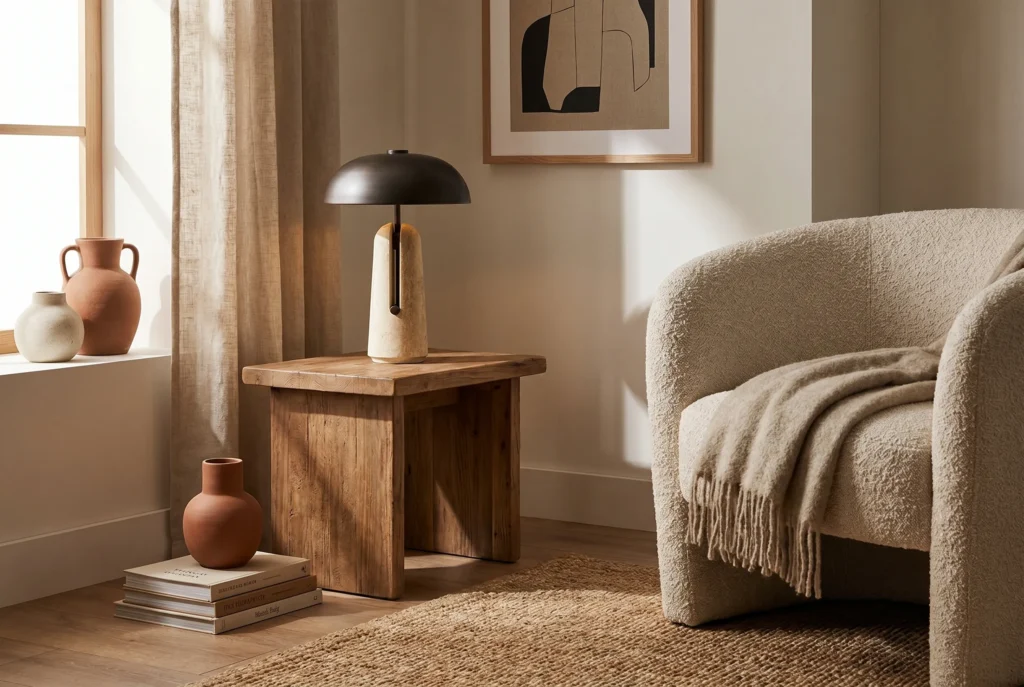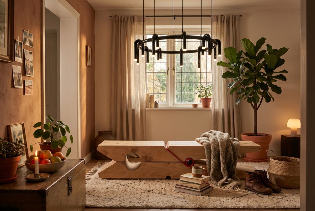 Compoziție minimalistă: lemn masiv și lumină suspendată