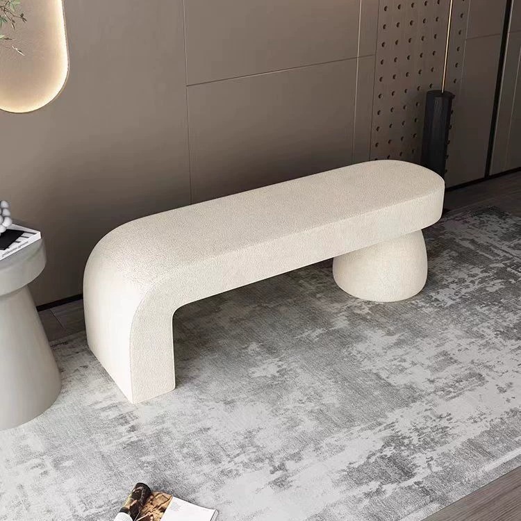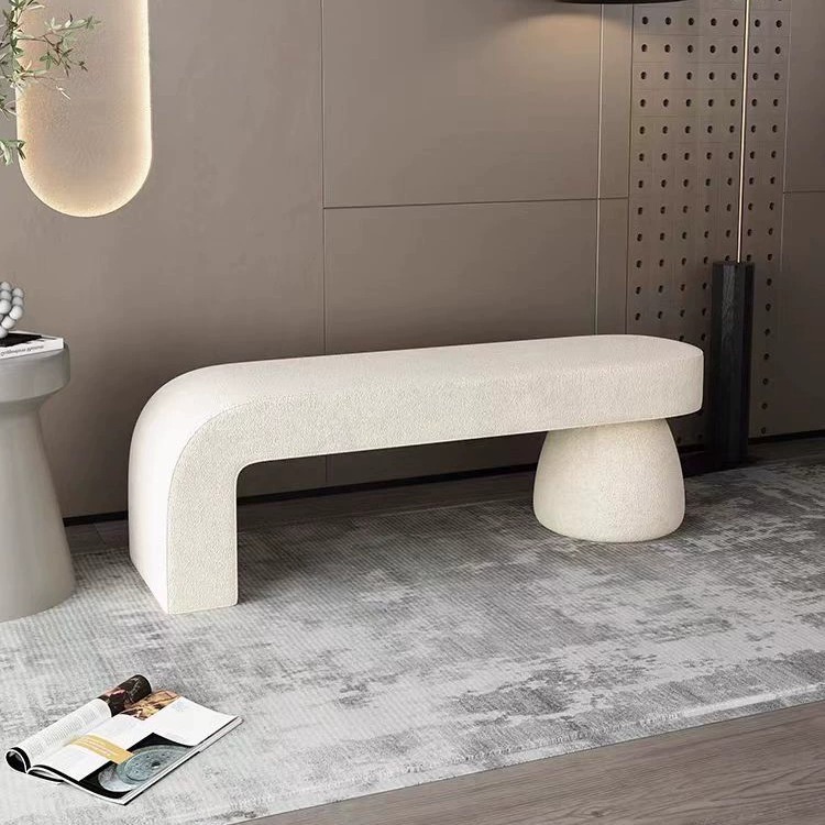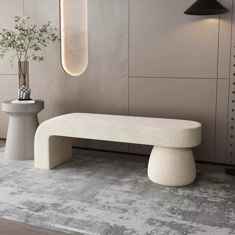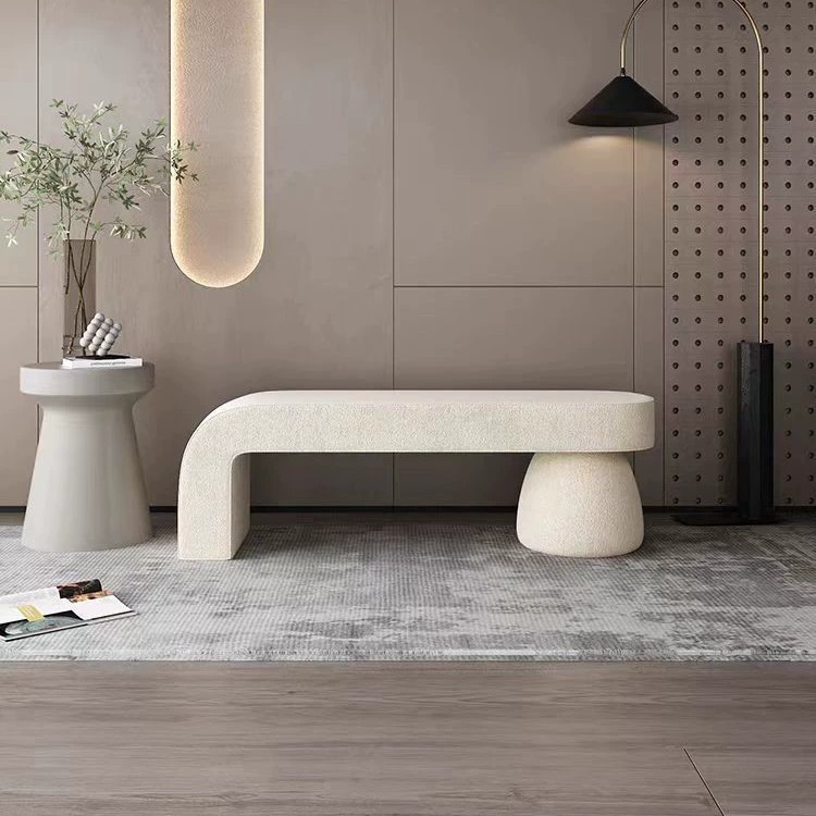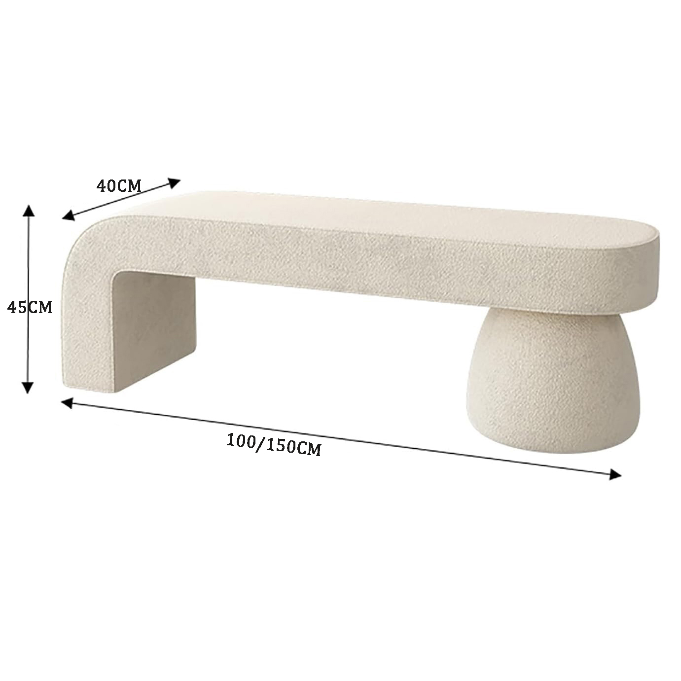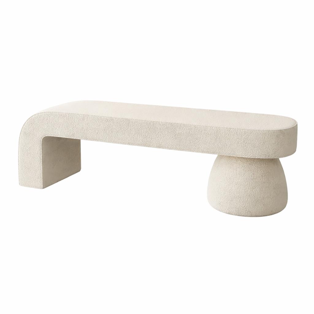 Banchetă de hol cu design modern și forme organice, finisaj texturat în nuanță crem. Are structură solidă, cu picioare asimetrice, fiind potrivită atât pentru ședere, cât și ca piesă decorativă în spații contemporane.