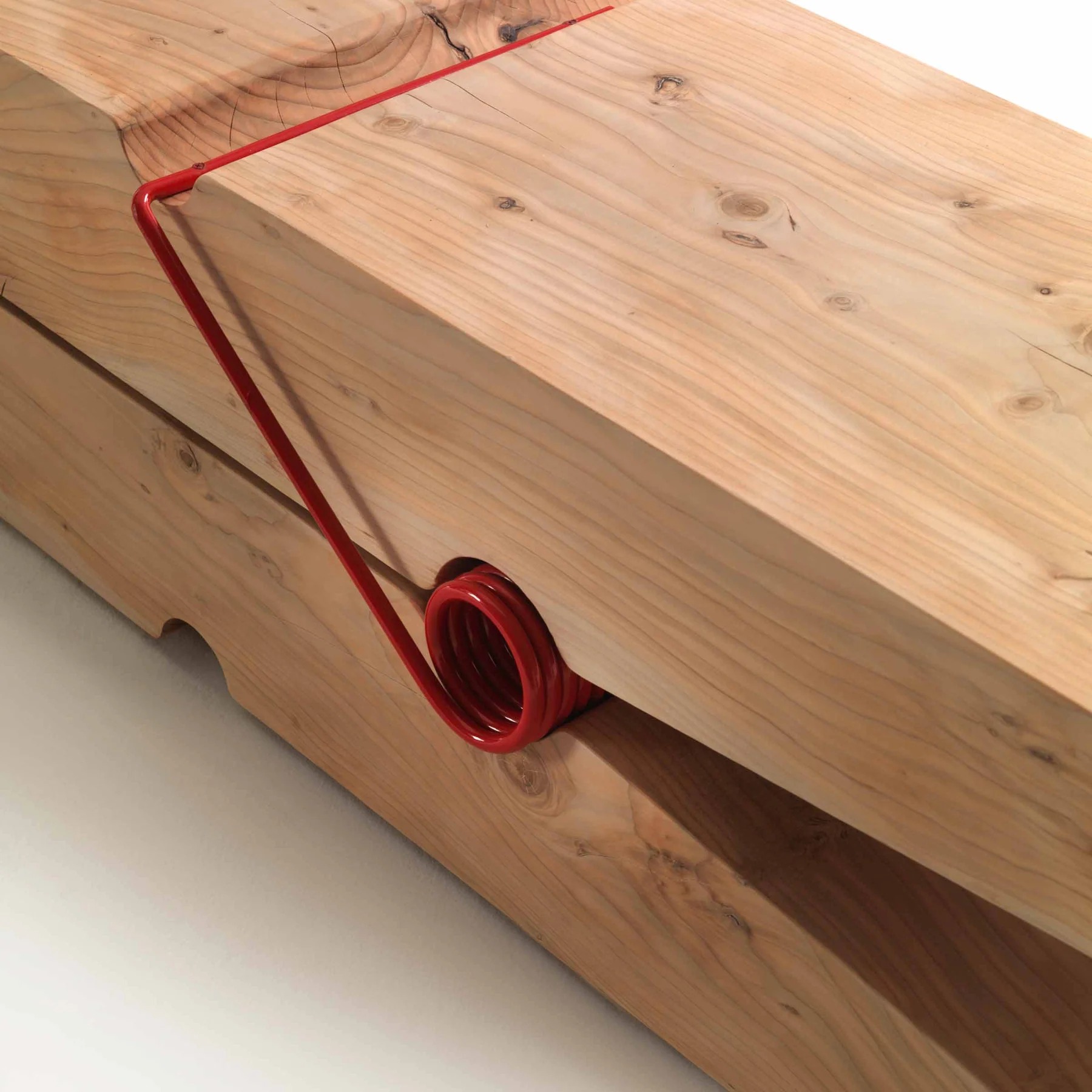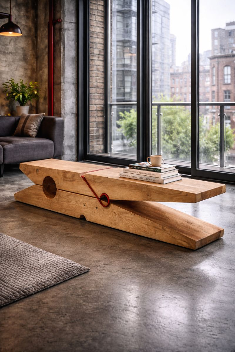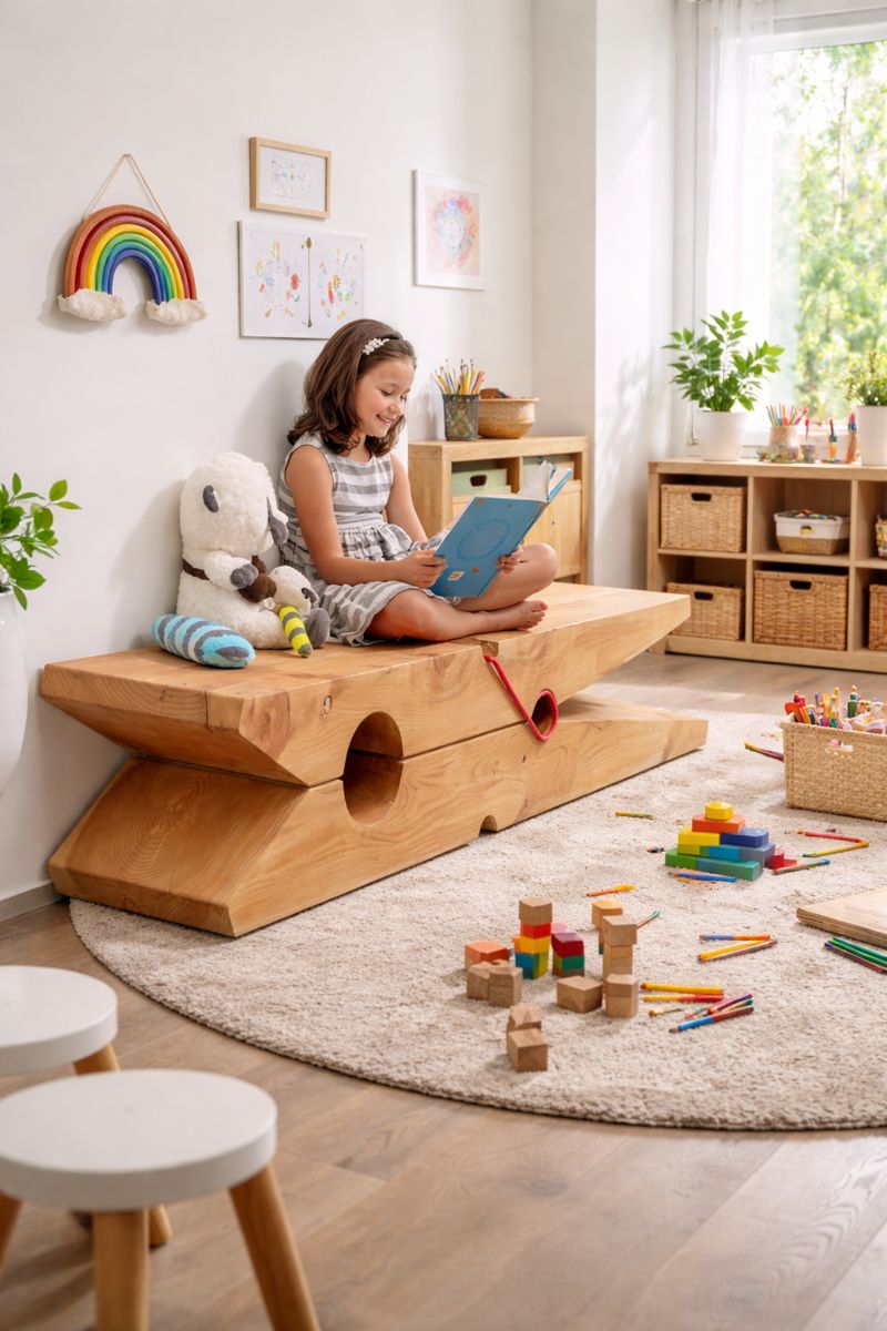 Banchetă realizată din lemn masiv natural, cu un design sculptural și expresiv.
