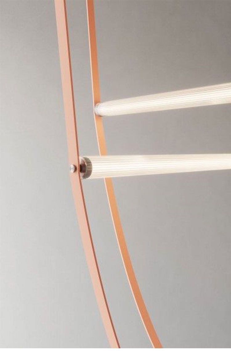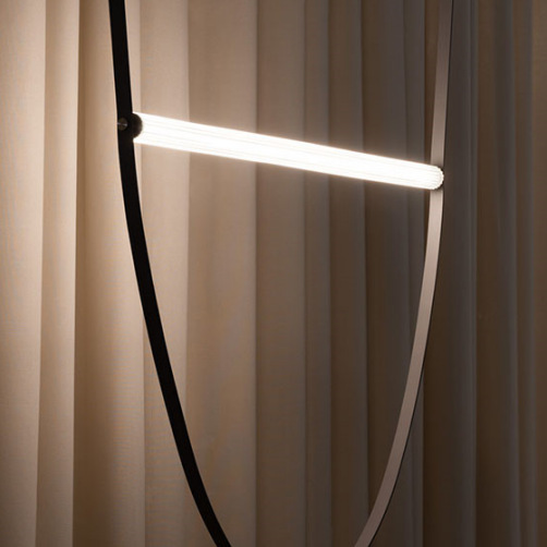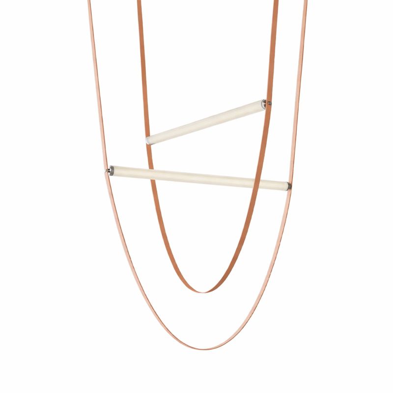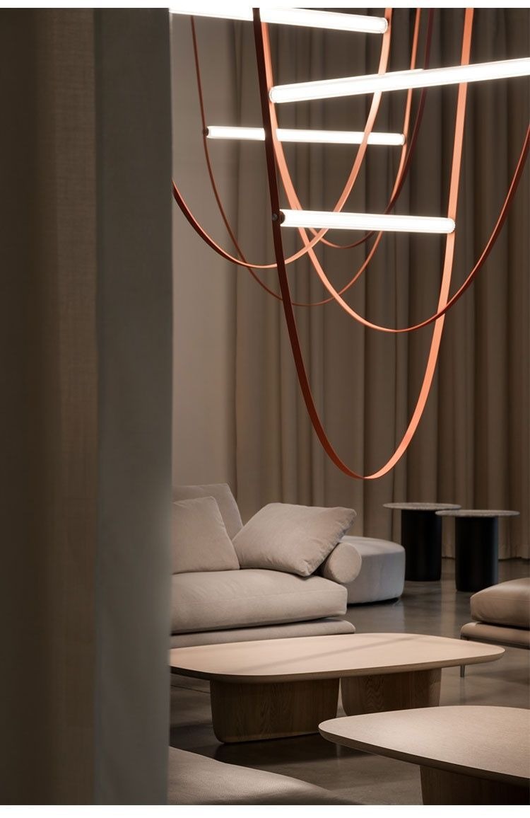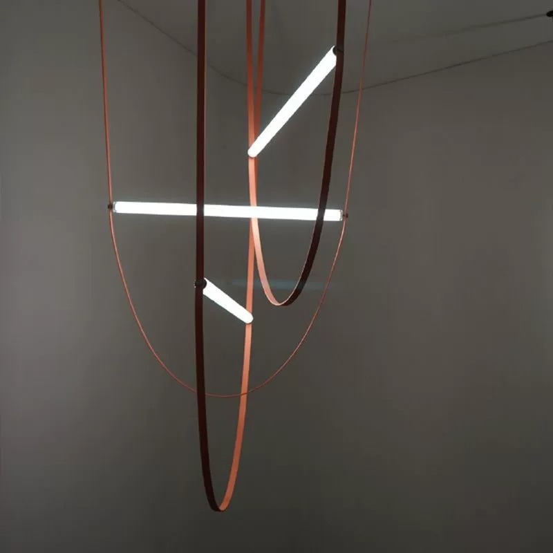 Acest corp de iluminat suspendat cu design contemporan îmbină armonios materiale neconvenționale precum pielea , acrilicul și fierul, rezultând o piesă decorativă cu impact vizual puternic. Benzile din piele creează linii fluide și dinamice, în timp ce elementele luminoase din acrilic oferă o iluminare clară, uniformă și modernă.