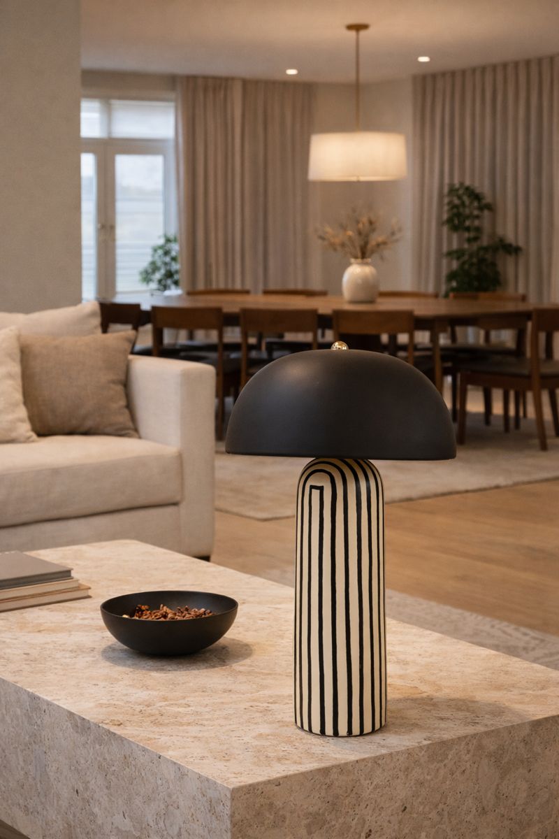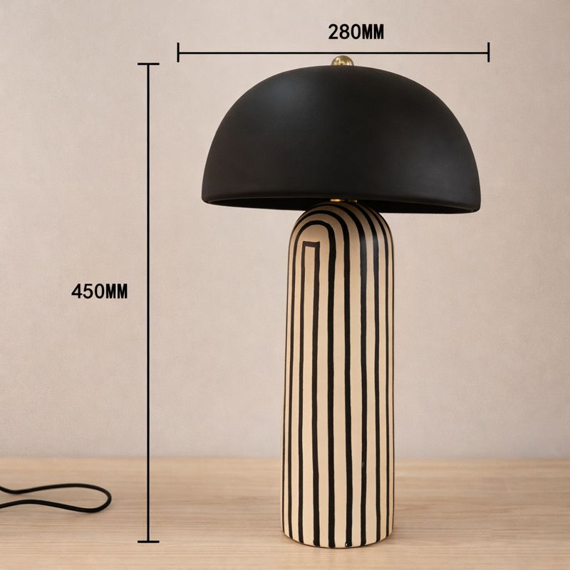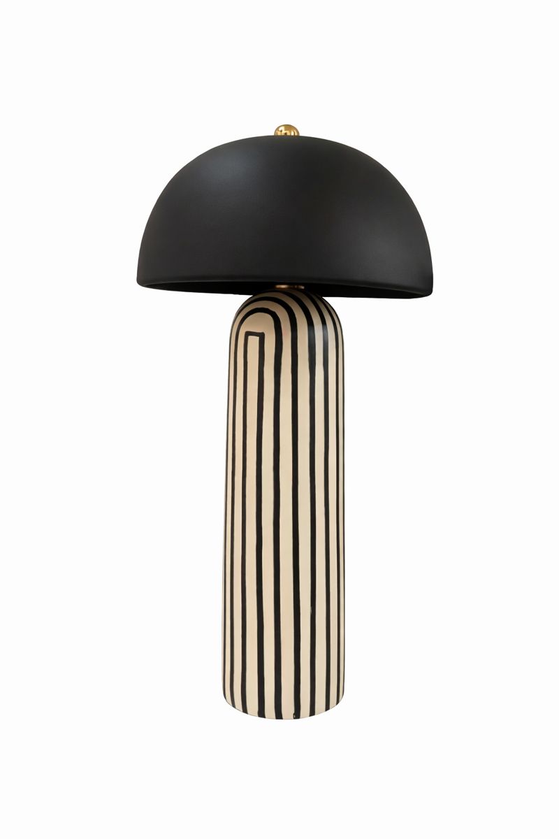 Lampă de masă cu prezență sculpturală, inspirată din dialogul dintre formă arhaică și expresie contemporană. Abajurul semisferic, opac și profund, plutește deasupra unei baze cilindrice decorate cu ritmuri grafice verticale, creând un contrast puternic între masiv și delicat, umbră și lumină.