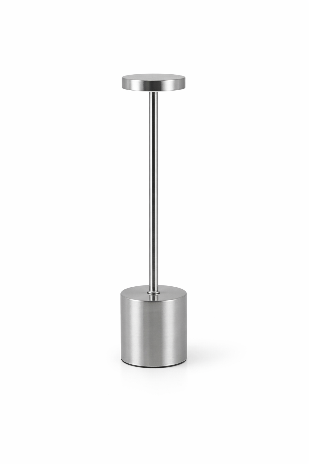 Lampă de masă cu design minimalist, definită printr-o siluetă pură și proporții echilibrate. Baza cilindrică stabilă susține o tijă subțire, culminând cu un cap circular discret, gândit pentru control tactil. Finisajul argintiu mat accentuează caracterul contemporan al obiectului și îi conferă o prezență calmă, arhitecturală.
