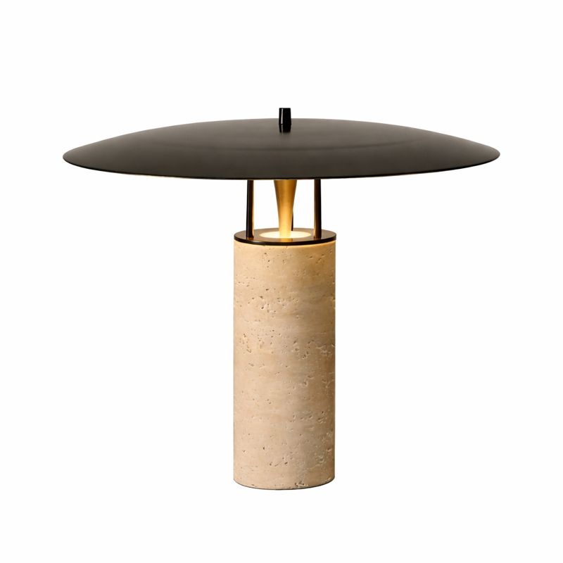 Adaugă un accent sofisticat spațiului tău cu această lampă de masă cu design contemporan, realizată din travertin natural și completată de un abajur metalic negru mat. Baza cilindrică din piatră naturală oferă stabilitate și un aspect elegant, în timp ce detaliile metalice cu finisaj cald creează un contrast rafinat.