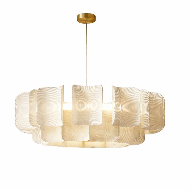 Această lustră suspendată prezintă un design echilibrat și armonios, realizat din panouri curbate, translucide, cu textură fină concentrică, care difuzează lumina într-un mod cald și relaxant. Forma sa aerisită și materialele mate creează o atmosferă calmă și elegantă.