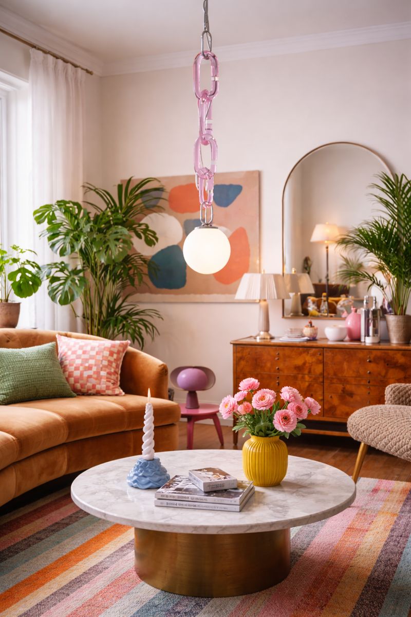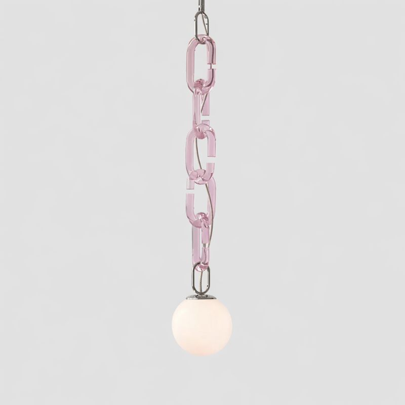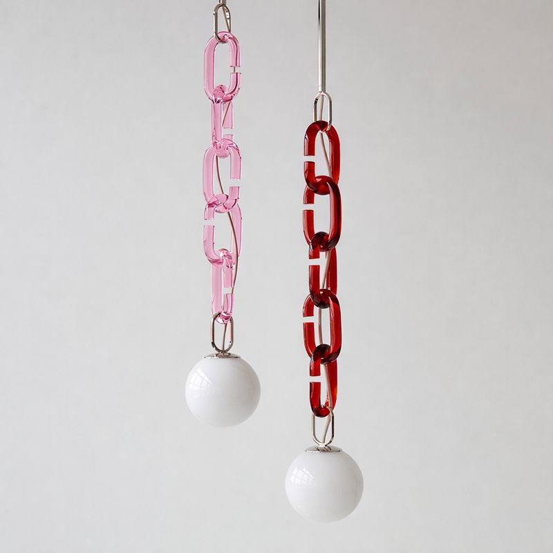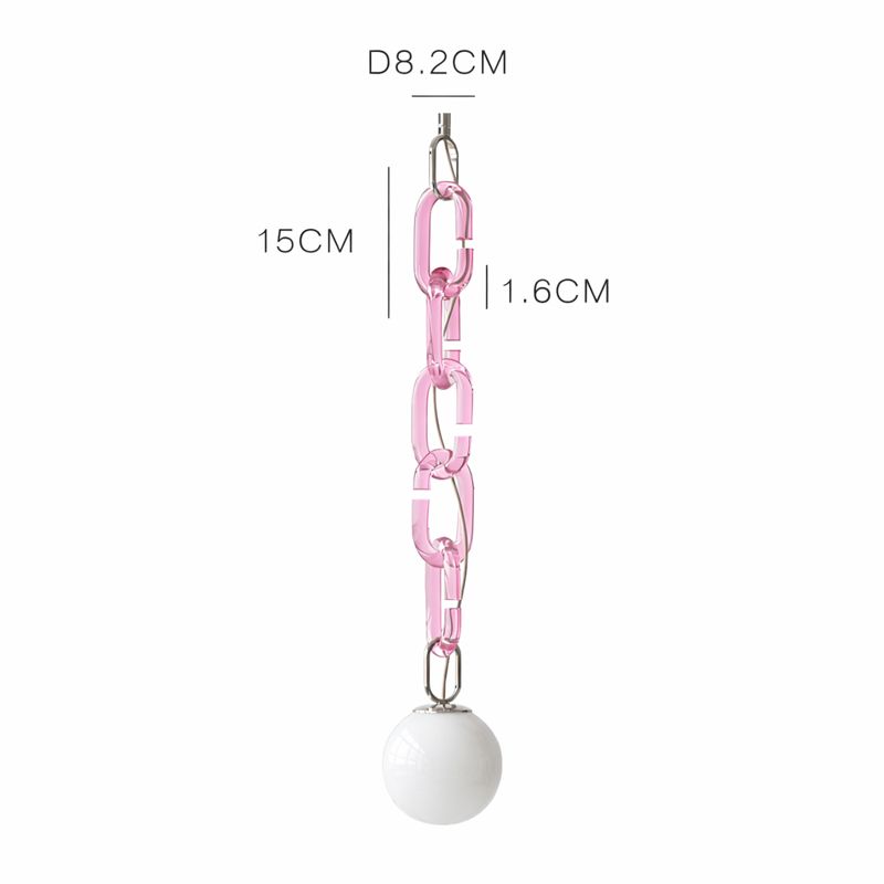 Lustră suspendată cu design modern și accent decorativ puternic, ideală pentru interioare contemporane, loft sau spații creative. Corpul de iluminat este suspendat printr-un lanț decorativ realizat din acril transparent colorat, care adaugă personalitate și un element vizual distinct întregii compoziții.