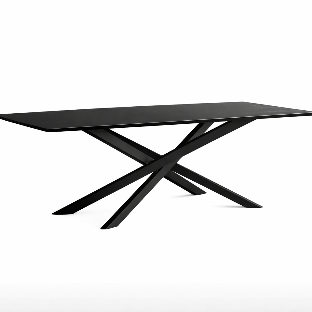 Masă cu design modern și minimalist, realizată din lemn de pin, cu blat dreptunghiular elegant și bază metalica geometrică în formă de X. Finisajul închis și liniile curate îi oferă un aspect sofisticat, ideal pentru interioare contemporane, industriale sau moderne.