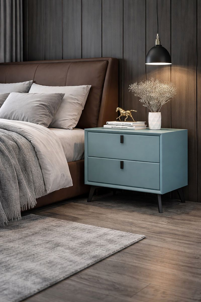 Această noptieră elegantă este realizată din MDF rezistent, îmbrăcat integral în piele ecologică de calitate superioară, oferind un aspect sofisticat și modern. Finisajul mat, cu textură fină, adaugă profunzime vizuală și un plus de rafinament, transformând piesa într-un element decorativ de impact pentru dormitor.
