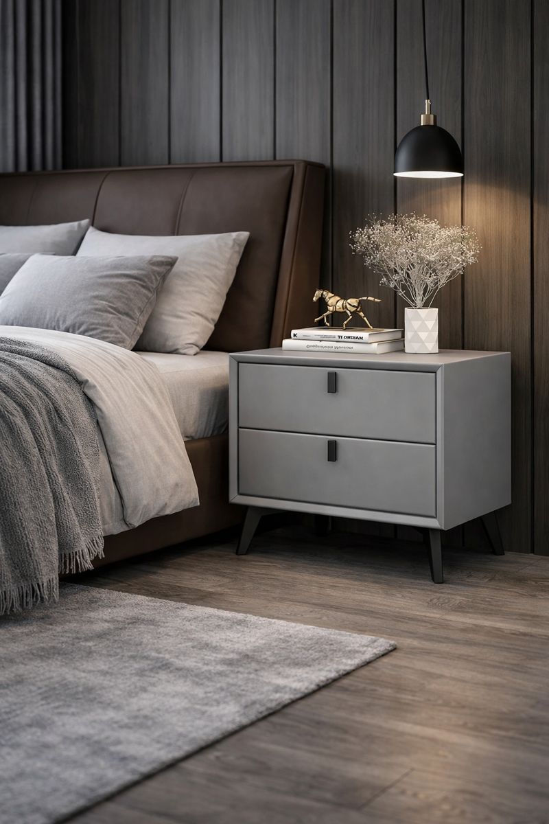 Această noptieră elegantă este realizată din MDF rezistent, îmbrăcat integral în piele ecologică de calitate superioară, oferind un aspect sofisticat și modern. Finisajul mat, cu textură fină, adaugă profunzime vizuală și un plus de rafinament, transformând piesa într-un element decorativ de impact pentru dormitor.