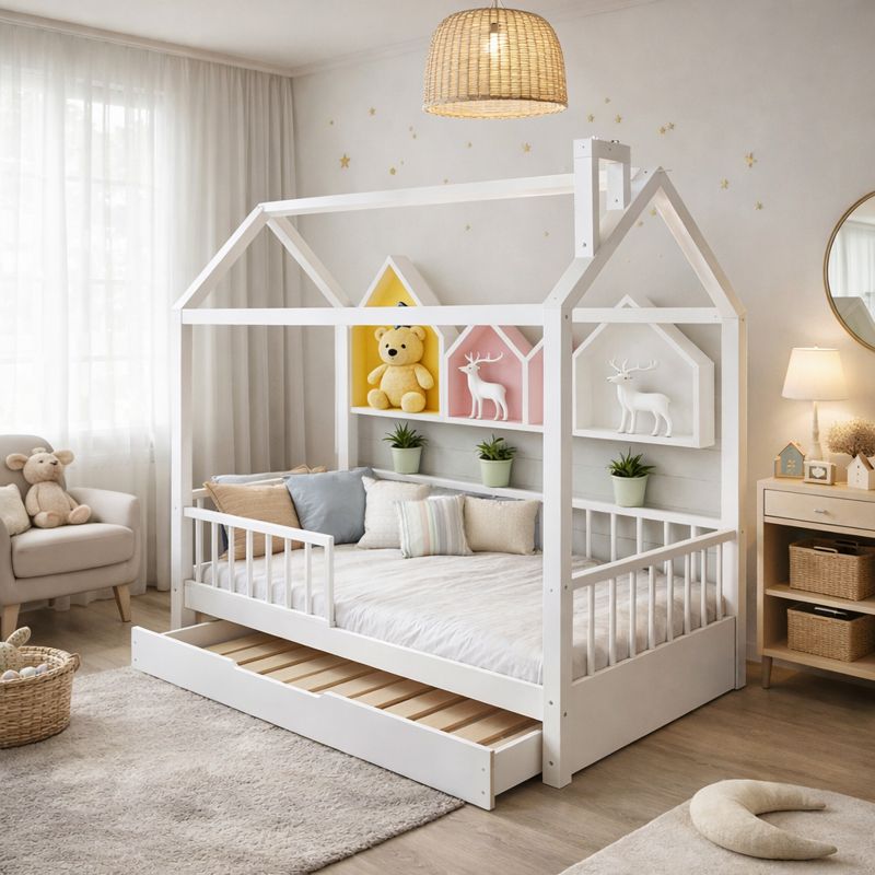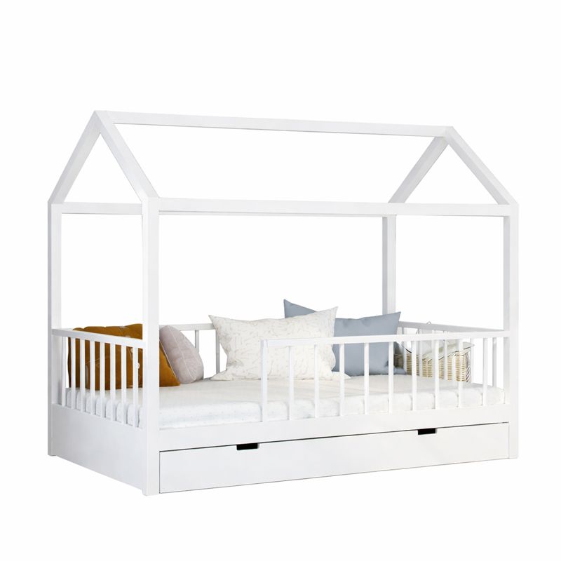 Acest pat tip căsuță este realizat din lemn de calitate, cu finisaj alb, și oferă un design modern, potrivit pentru orice cameră de copil. Forma de căsuță creează un spațiu plăcut și sigur, ideal pentru somn, joacă sau relaxare.