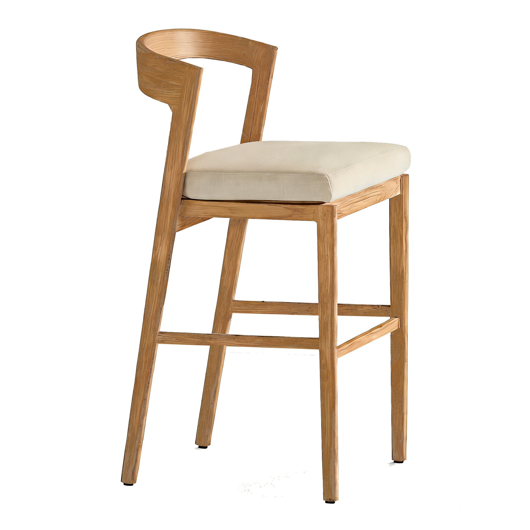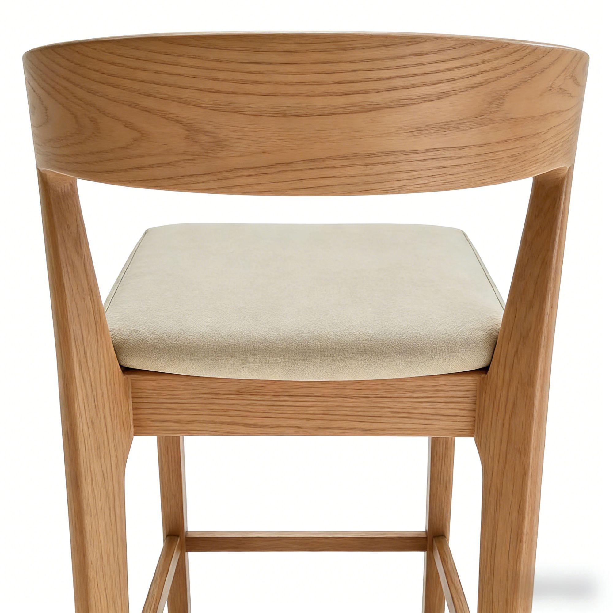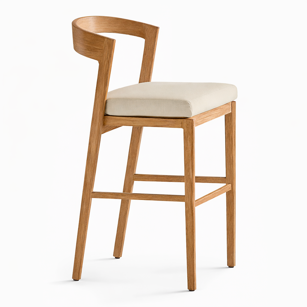 Scaunul de bar este realizat din lemn masiv, cu finisaj natural, evidențiind textura și fibra lemnului pentru un aspect cald și elegant. Designul său modern, cu spătar curbat și linii fluide, oferă atât susținere ergonomică, cât și un plus de rafinament.