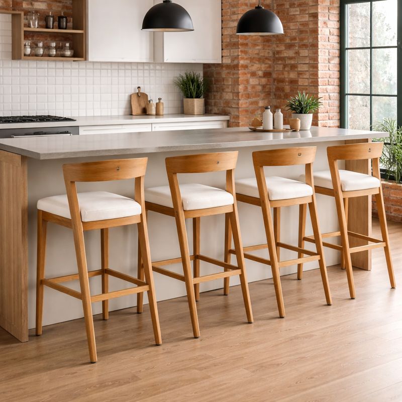 Șezutul este tapițat cu material textil într-o nuanță neutră, asigurând confort sporit chiar și la utilizare îndelungată. Structura solidă, completată de suport pentru picioare, garantează stabilitate și durabilitate, fiind ideal pentru bucătării cu insulă, baruri sau spații HoReCa.