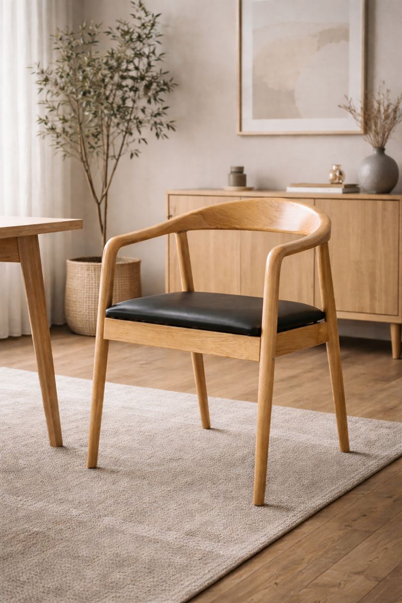 Acest scaun de dining din lemn și piele ecologică este conceput pentru a aduce un echilibru armonios între estetică naturală și confort funcțional. Structura solidă din lemn, cu finisaj atent realizat, evidențiază textura naturală și oferă stabilitate pe termen lung.