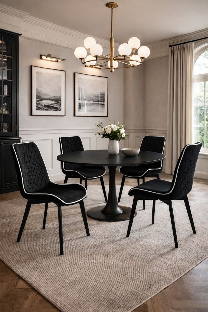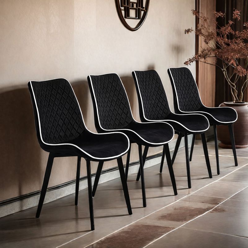 Spătarul cu model matlasat tip diamant și forma ergonomică asigură susținere optimă și confort sporit, chiar și în utilizare îndelungată. Picioarele metalice negre, solide și stabile, completează designul contemporan și oferă durabilitate în timp.